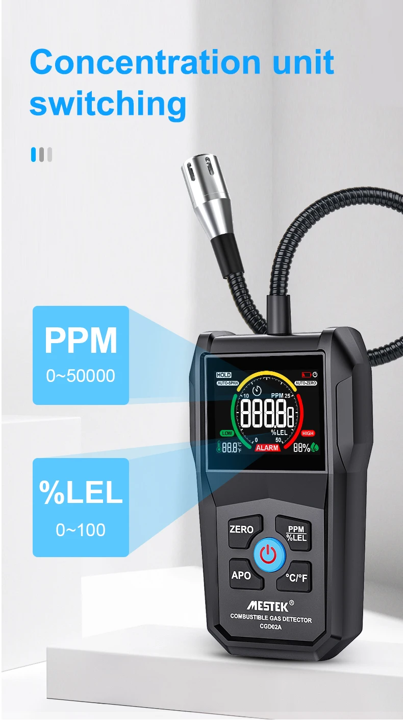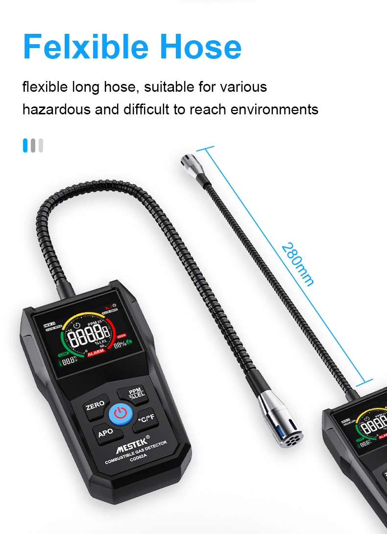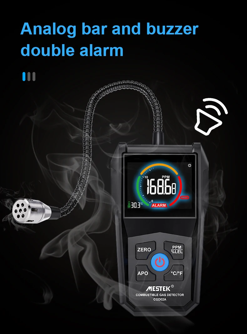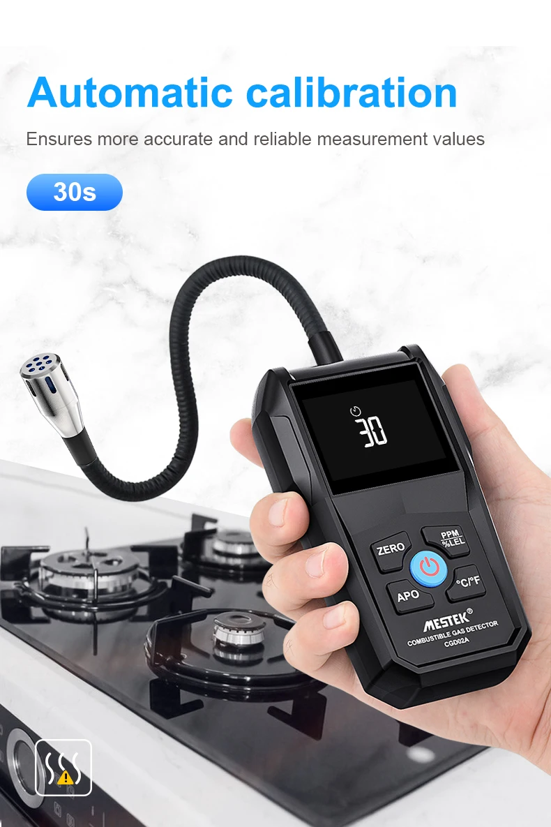 O Mestek Detector de Gás identifica instantaneamente qualquer vazamento de gás inflamável — como metano, gás natural, propano, butano e muito mais — alertando com som e luz antes que o perigo aconteça.