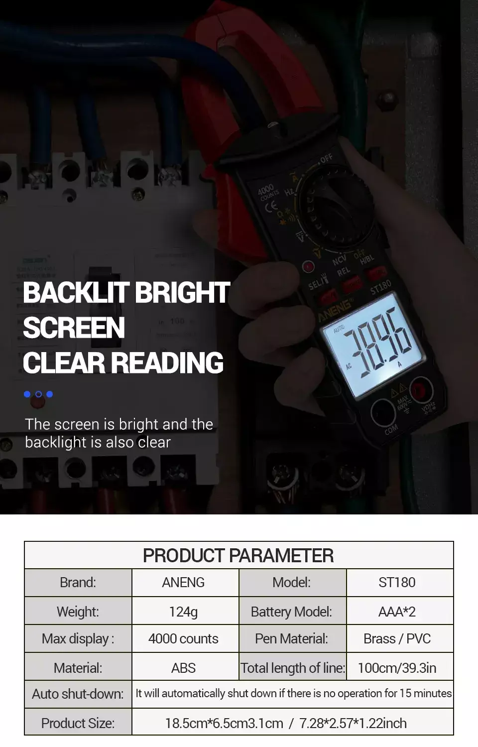 O ANENG ST180 combina alta precisão, 4000 contagens, detecção NCV e função alicate amperímetro em um único aparelho compacto e poderoso. Com ele, você mede corrente, tensão, capacitância, resistência, frequência e muito mais — com total facilidade, mesmo em espaços apertados e trabalhos complexos.